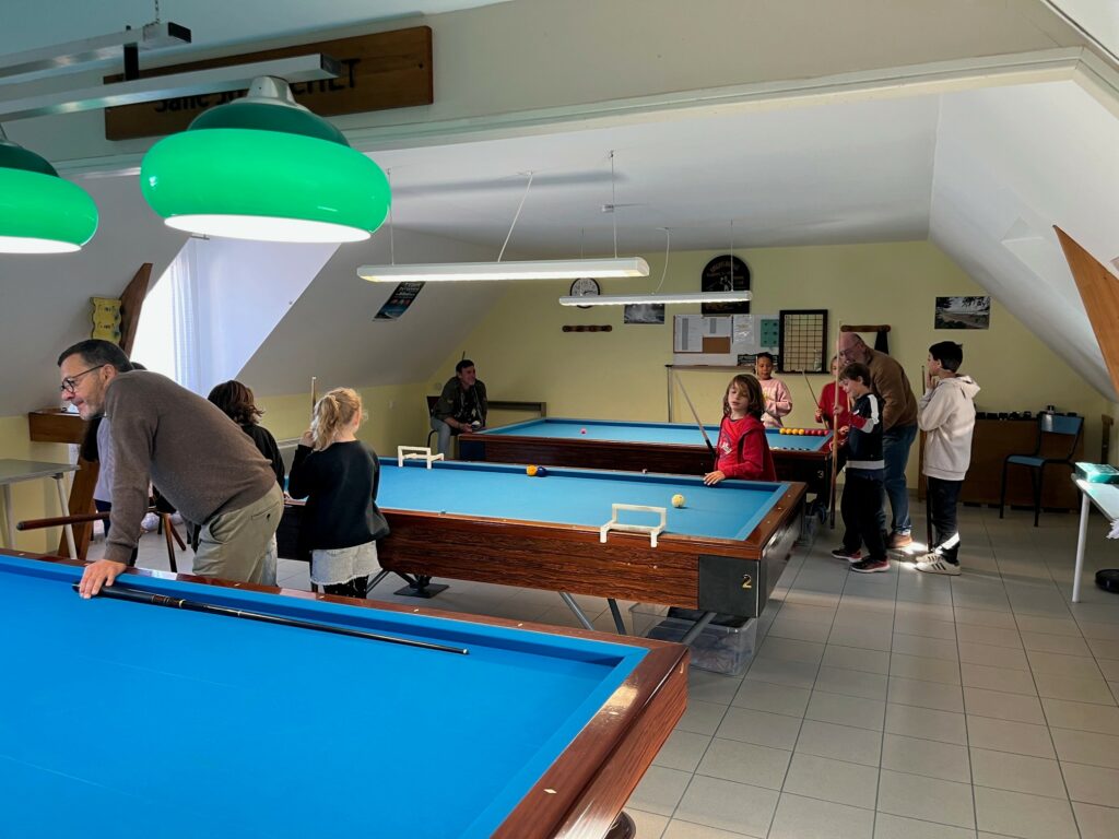 🎱 Sur les billards, après une présentation du jeu de carambole et de ses subtilités, les enfants ont pu mettre leur adresse à l’épreuve sur les trois tables mises à disposition. Les variantes ludiques — billard-pétanque et billard-foot — ont rencontré un franc succès, mêlant amusement et esprit de compétition. Les trajectoires des billes ont été vite assimilées, et les animateurs ont repéré plusieurs jeunes particulièrement habiles, capables de jolis coups dès leurs premières tentatives.